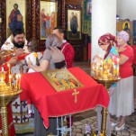 Несмотря на жаркую погоду в это утро и рабочий день недели, в храме было много людей. Среди верующих, желающих причаститься, было много детей и именинников.